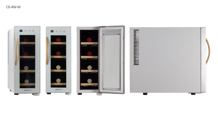 『CE-4W』は本格的な仕様を重視し、日本メーカー製ペルチェの採用をはじめ、タッチパネル式操作部、前面木製ワイン棚、木目調ドアハンドルなど、コンパクトサイズながら上位機種と同等のスペックを施した高品位モデルです。