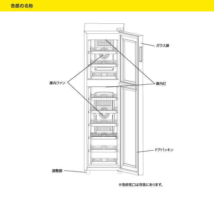 冷却能力は使用環境温度(10~30℃)の範囲内でご使用の場合、周囲温度より最大約-15°Cです。 設定温度と実際の庫内温度は周囲温度により異なります。