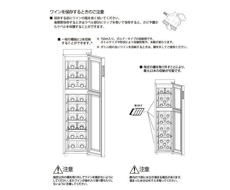 ワインセラーを積み重ねたり、棚の上などに置かない