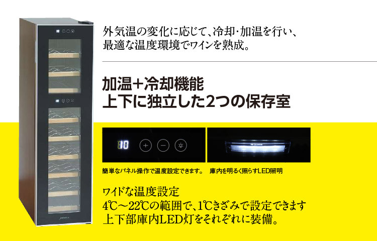 加温機能+冷却機能を備えた常備の庫内、冷却専用の下部の庫内のツインルーム式。異なる温度設定で、それぞれのワインに合わせた環境で保存できます。 加温機能付きの上部庫内は、冬場の(外気が低い環境での)赤ワインの保存などに最適です。例えば、外気が10℃の場合でも、庫内を14℃など、外気より高い温度で保つことが可能です。