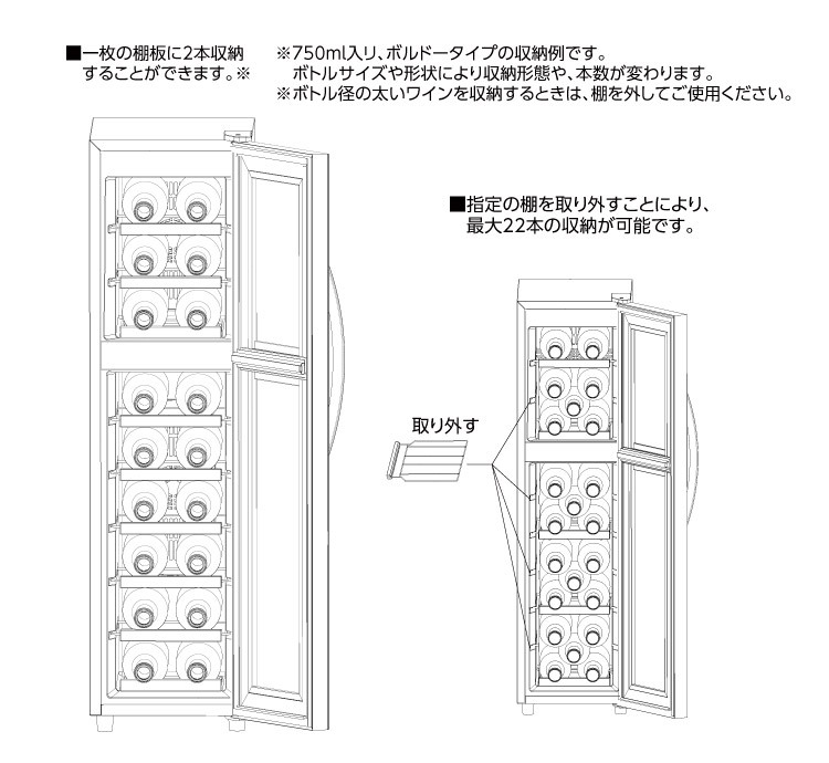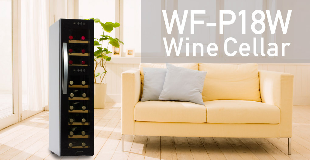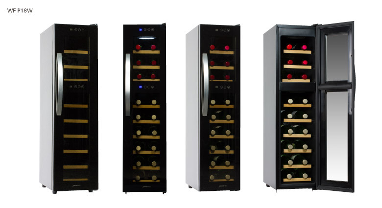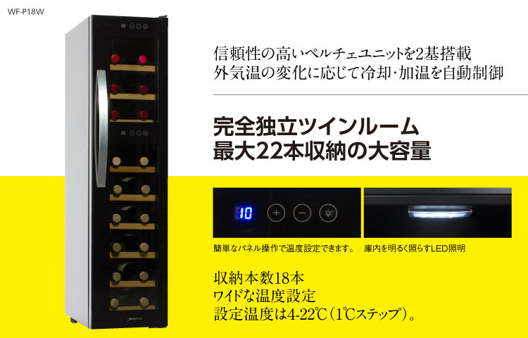 『WF-P18W』は、日本メーカー製の高信頼性ペルチェ素子を使用した冷却ユニットを2基搭載した18本用のワインセラーで、最大22本の収納が可能になっています。※ボルドータイプの場合。