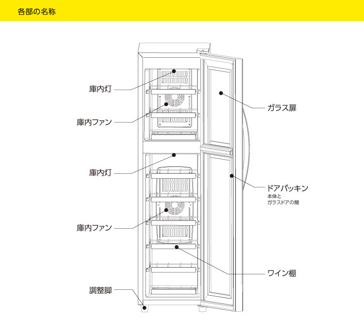 | ● 水の流れるような音がする場合があります、故障ではありません。 ● しっかりした床に設置してありますか?(水平ですか?) ● ワインボトルが、がたつきがないように正しく収納されていますか? |